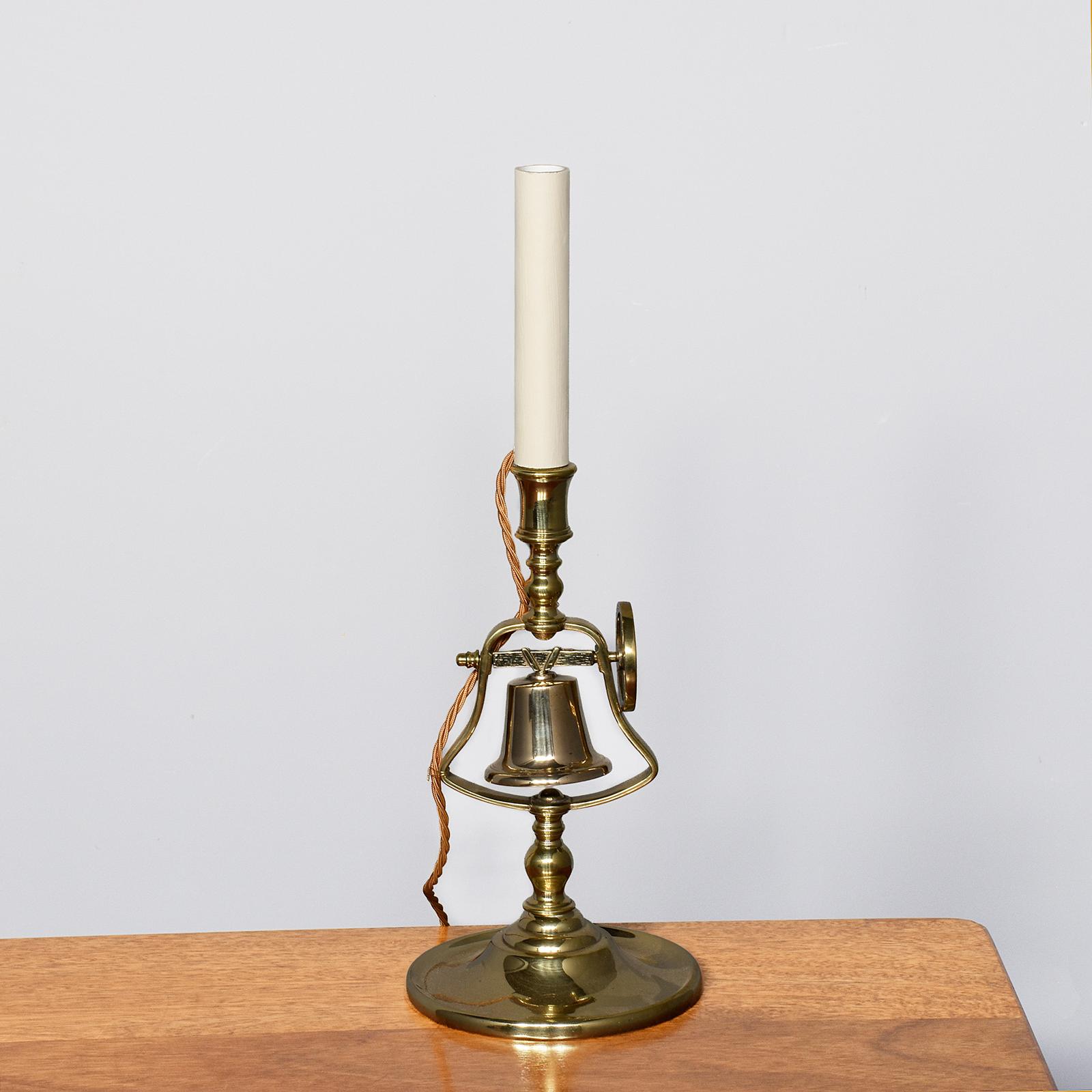 Circa 1860. Mid-Victorian cast brass tavern bell candle stick (recently converted to electricity), the top surmounted with a large faux candle resting on the brass nozzle, beneath this there is a small brass wheel in faux wood pattern and a bell supported on a faux beam, when the wheel rotates it rings the bell, contained in a frame in the form of a bell, supported on a simple brass stem on a large dished base.