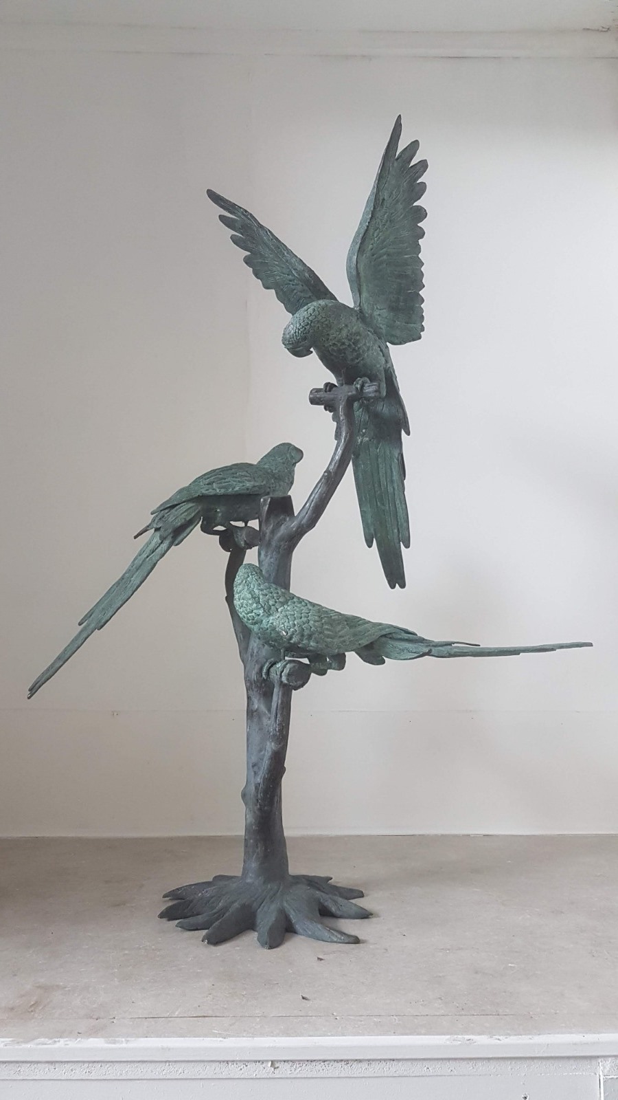Cast Bronze Sculpture of Three Parrots Perched on a Tree