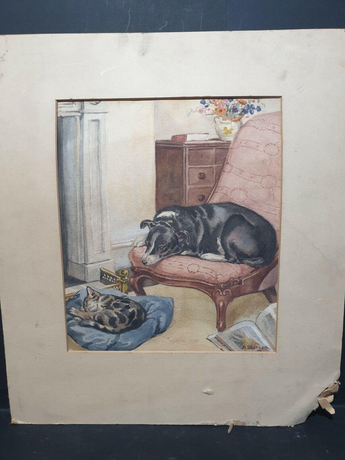 Cat & Dog Signed B Butler Watercolor in the Living Room c.1920