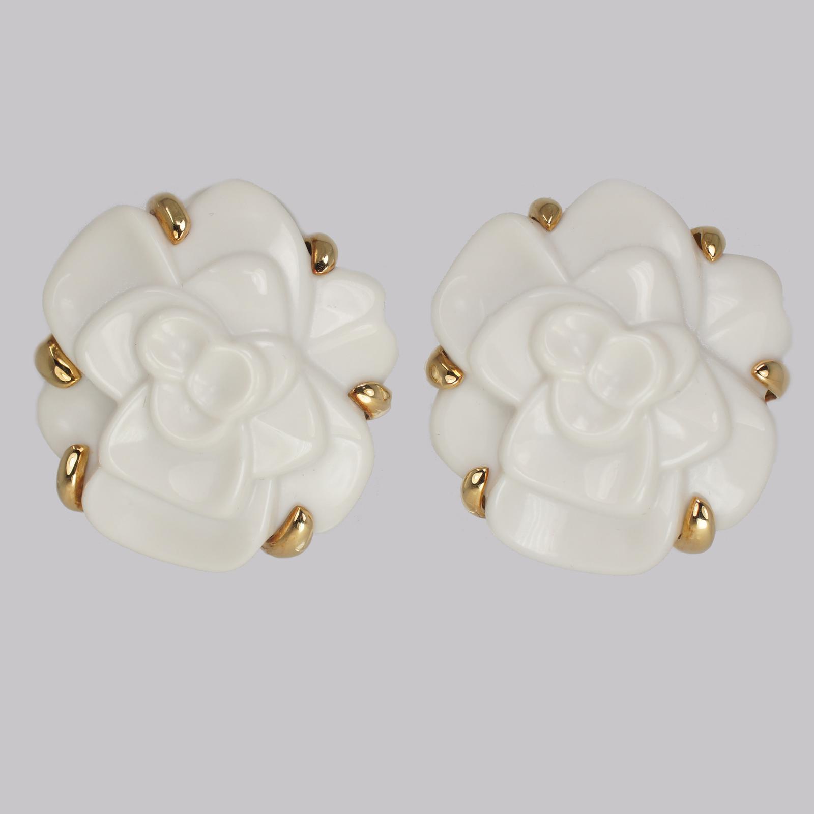 Chanel Camelia Earrings 18ct Gold White Agate Vintage Chanel 1" Flower Earrings