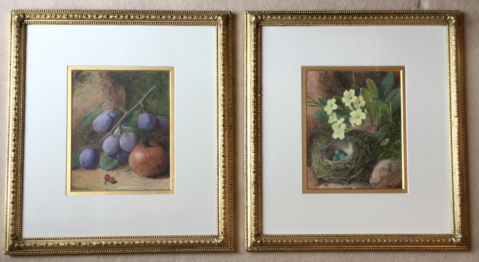 Charles Henry Slater Pair of Watercolours ‘Plums, Pomegranate, Primroses & Birds Nest’