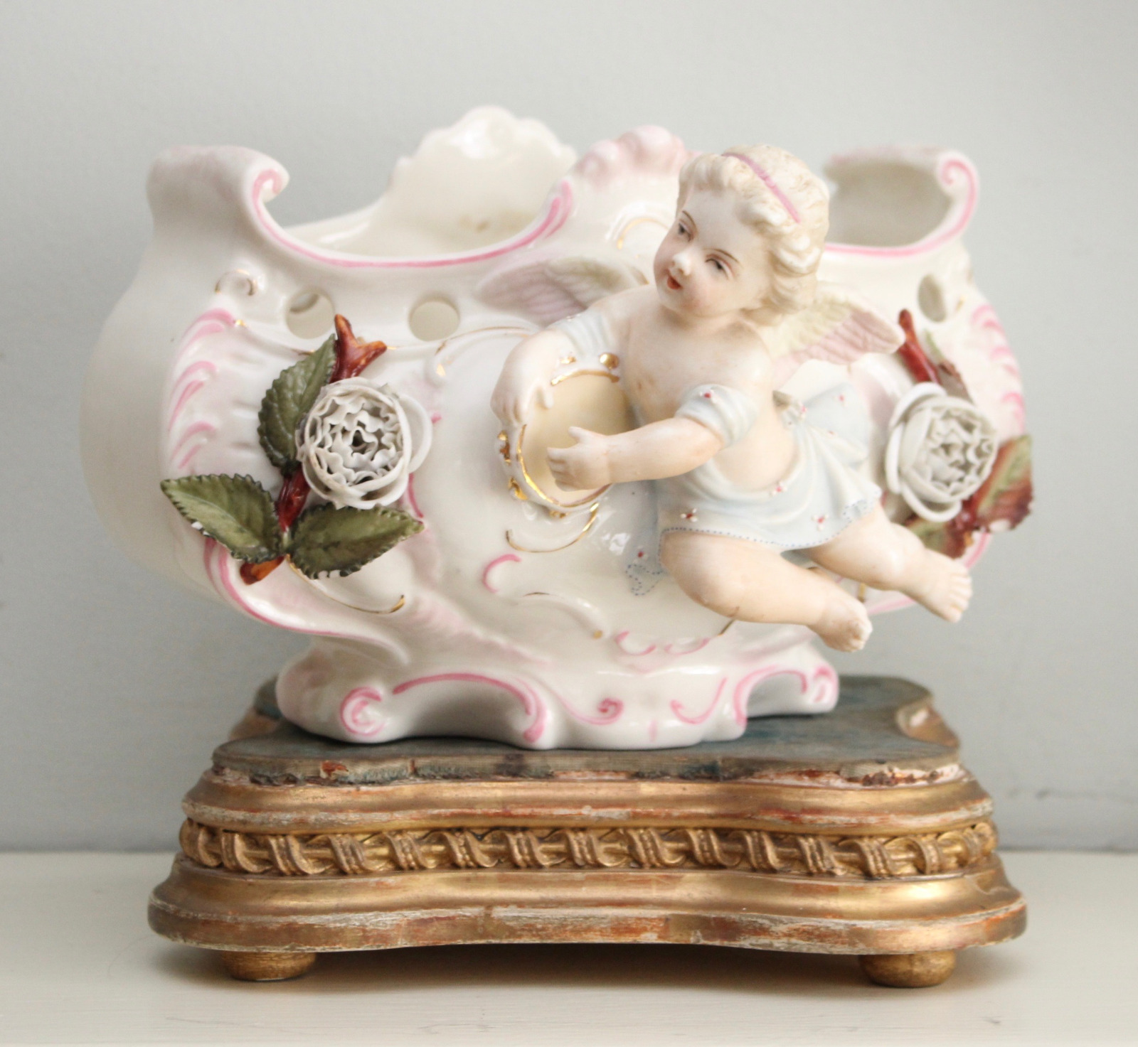 Charming Antique Late 19th Century French Ceramic Cherub & Tambourine Cachepot, Deposé