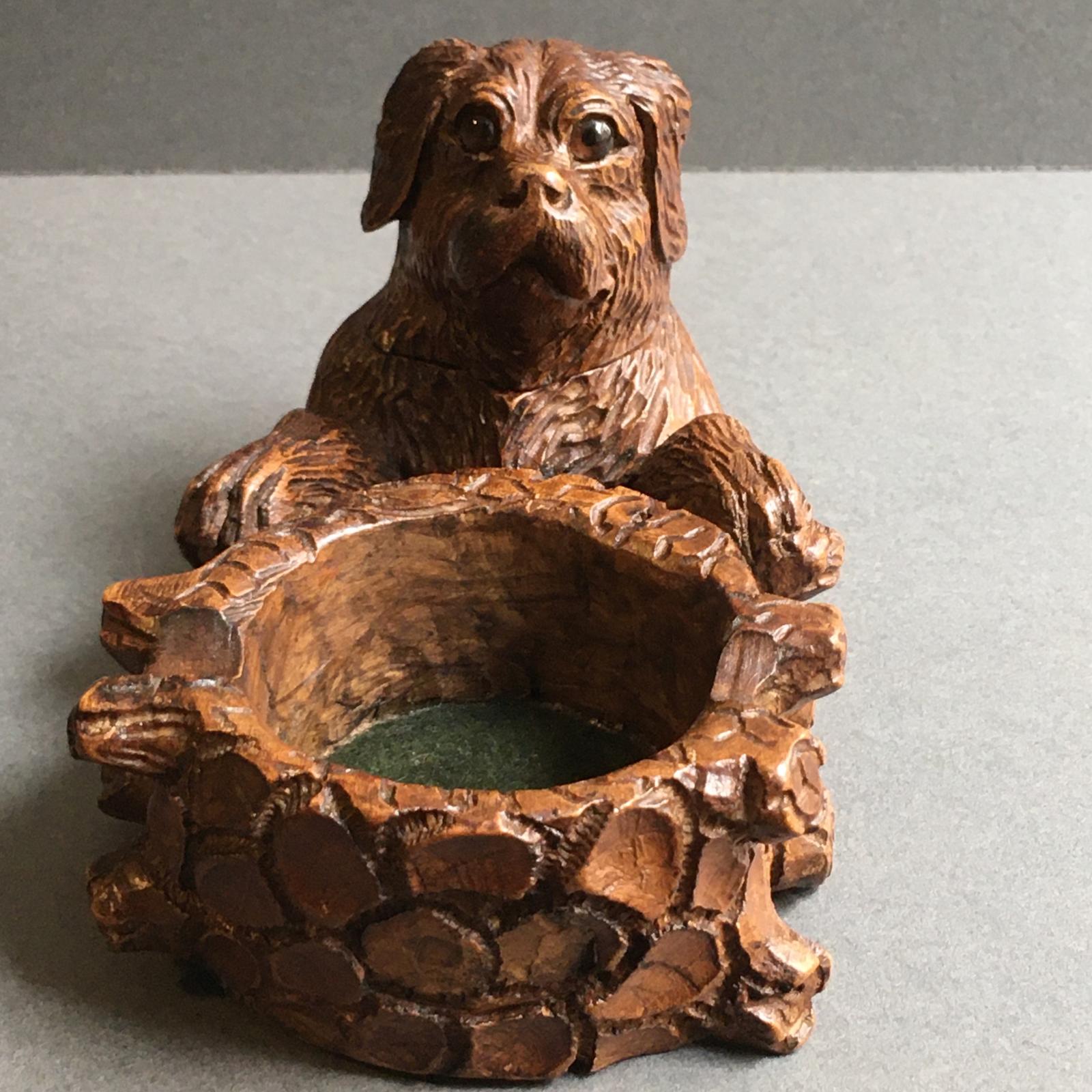Charming Black Forest Inkwell & Pen Holder Carved as a Dog at a Tree Stump
