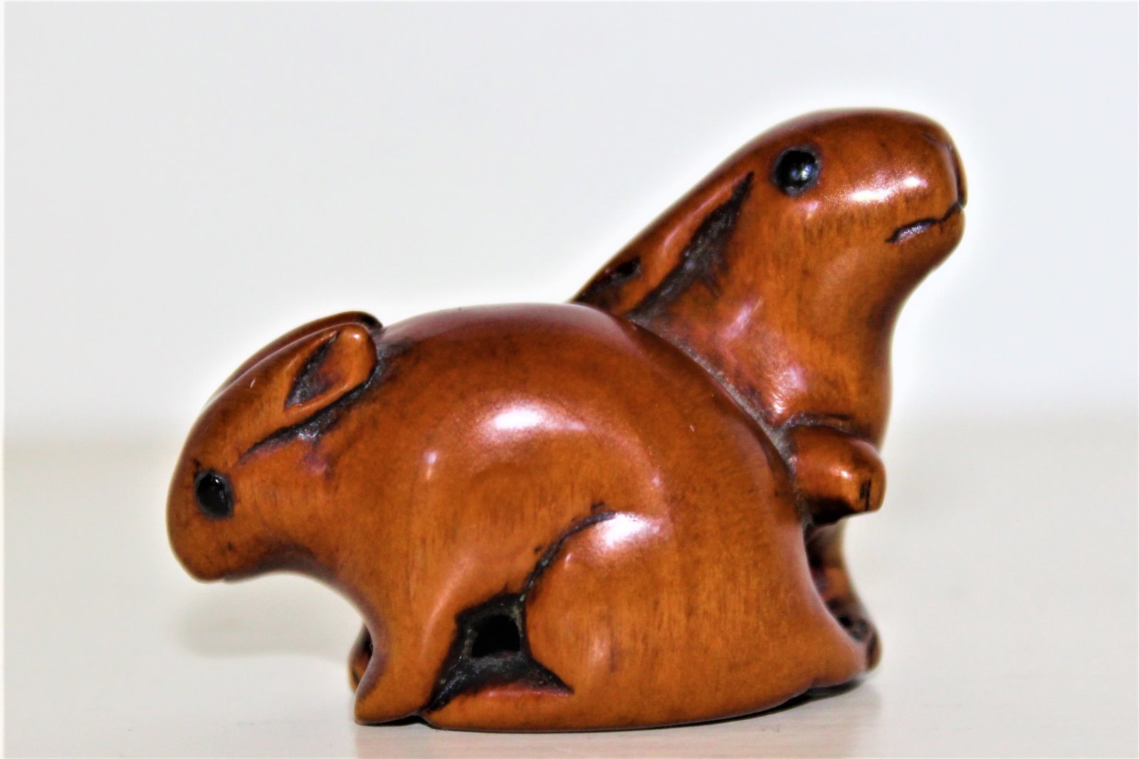 Charming Carved Boxwood Netsuke of a Mouse & RAbbit Japanese C.1880