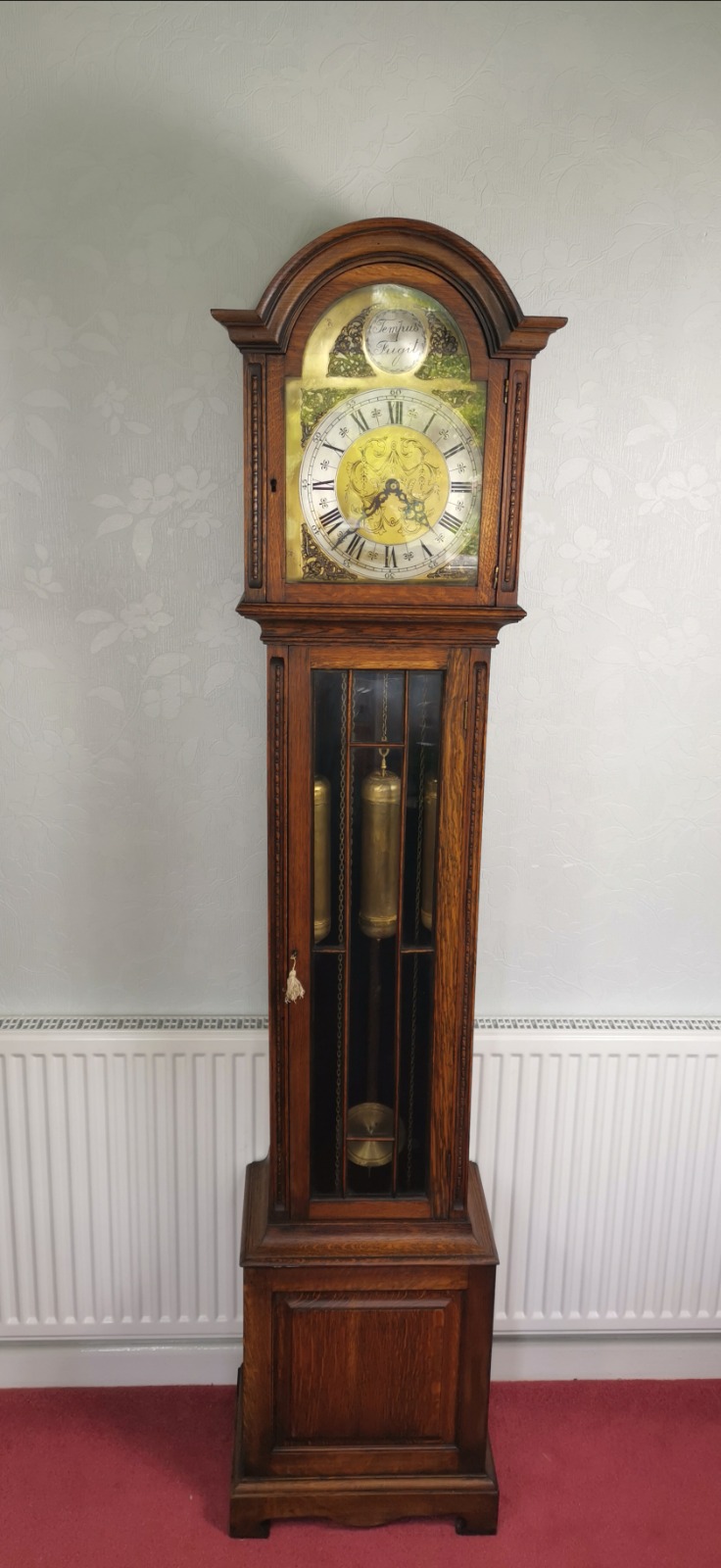 Charming English 1920s Westminster Quarter Chiming Triple Weight Oak Grandmother or Grandfather Longcase Clock (1 of 1)
