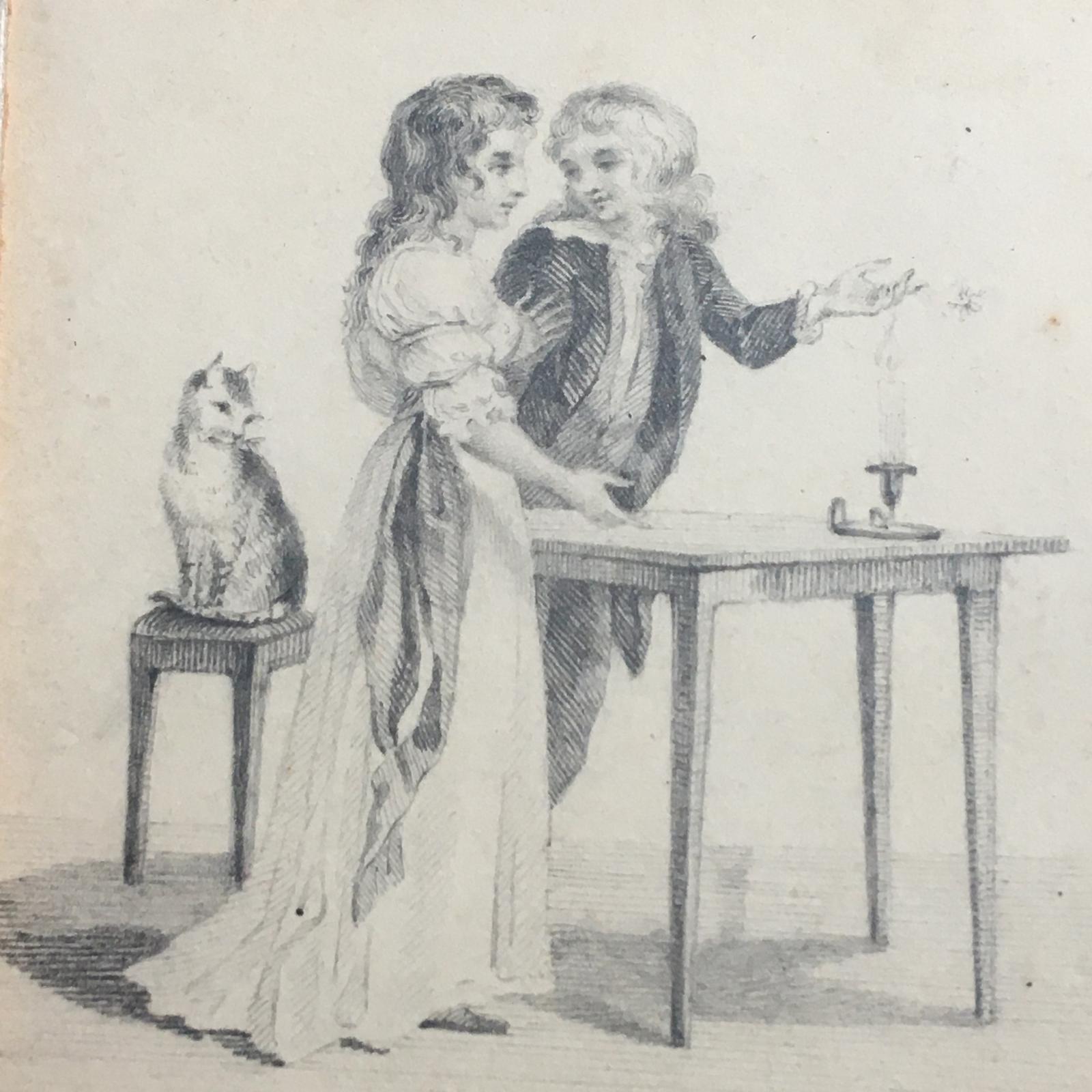 Charming Miniature Graphite Drawing of a Young Couple & Their Loyal Seated Cat