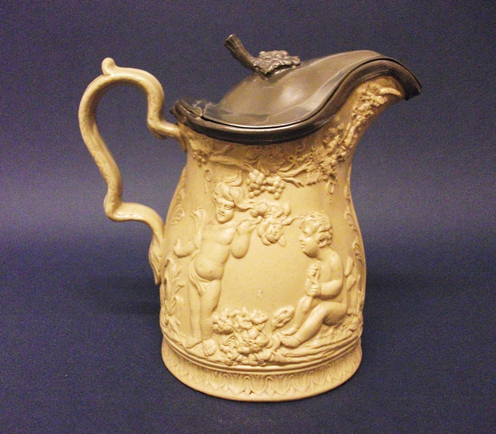 Charming Small Size Staffordshire Stoneware Jug with Pewter Cover c.1830