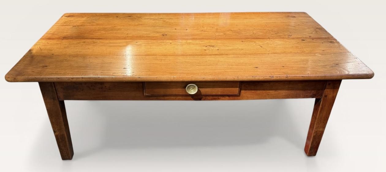 A French cherrywood country table reduced in height to make a very attractive and useful coffee table. On tapered straight legs with a large drawer to one end. Lovely warm colour and all in excellent condition.