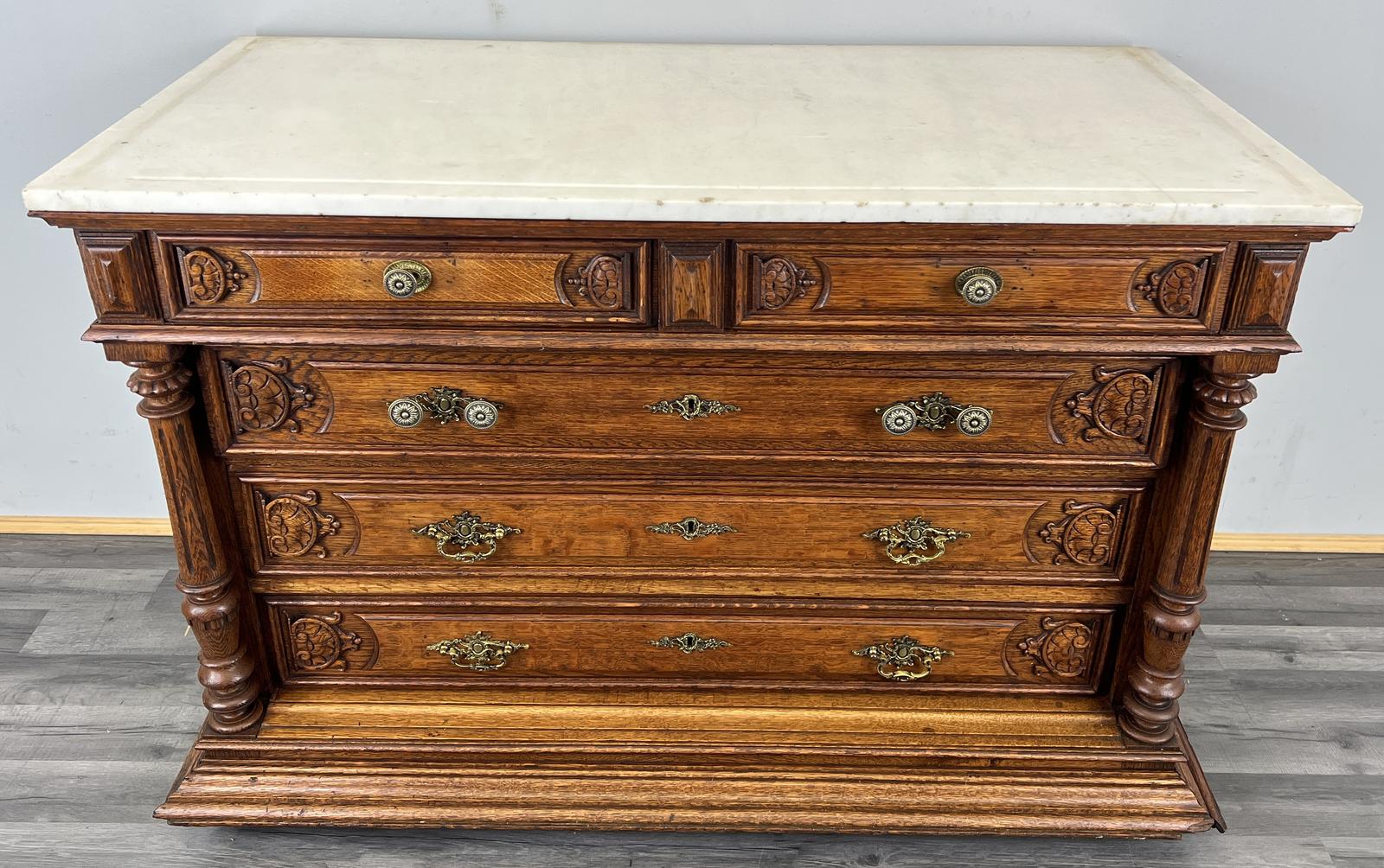 Chest of Drawers Antique French Style Marble Top Oak Carved Cabinet