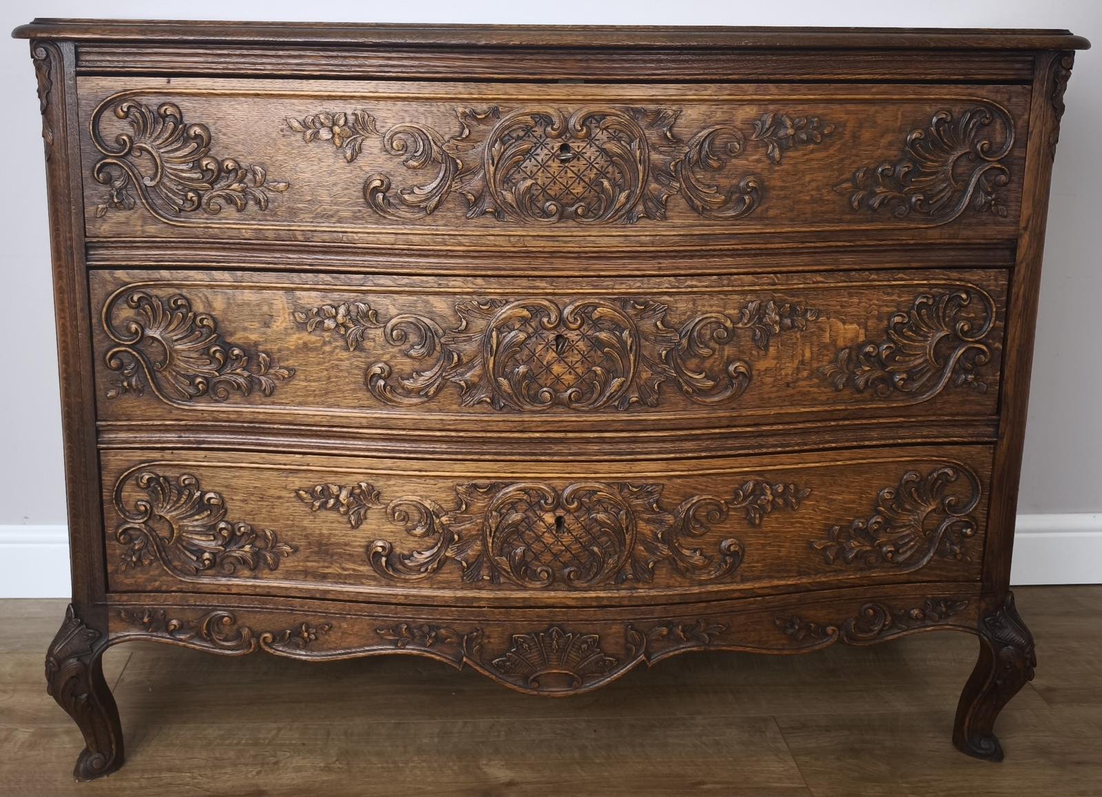 Crafted in oak, this piece features rich grain patterns enhanced by intricate carved motifs across all three drawers. The serpentine front adds depth and elegance, while the shaped apron and cabriole-style legs complete its classic French Louis styling. The warm finish highlights the natural beauty of the wood, making it a striking statement piece.