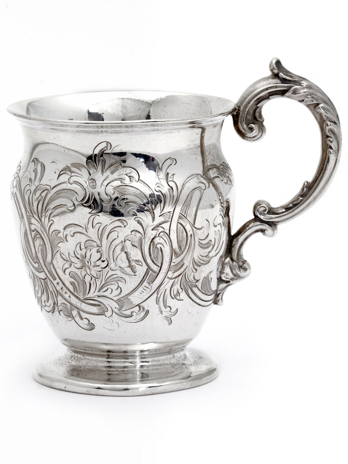 Childs Antique Silver Christening Mug Hand Engraved with a Scroll and Floral Design