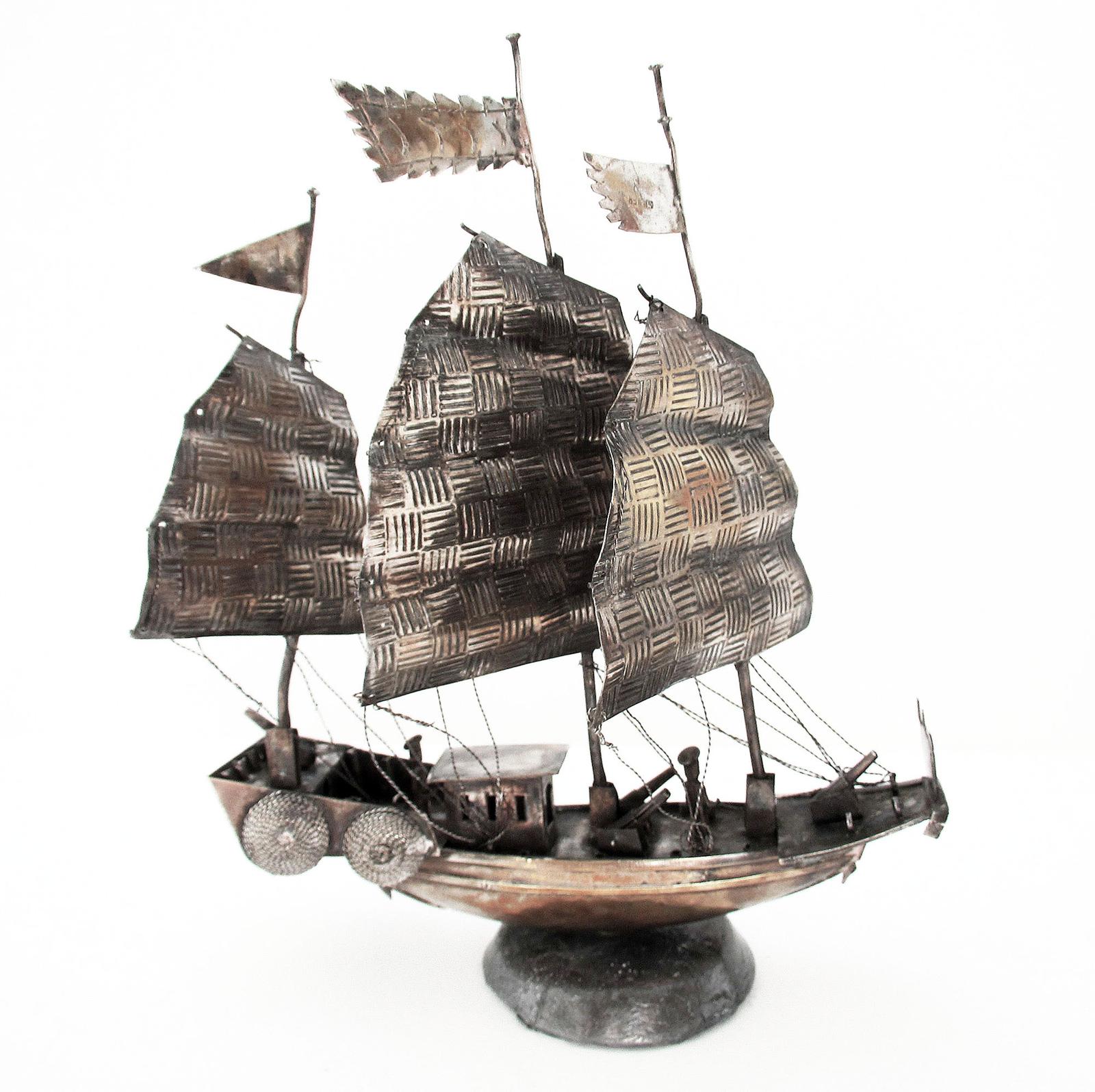 Chinese Antique Silver Metal War Junk Masted Sailing Ship Model