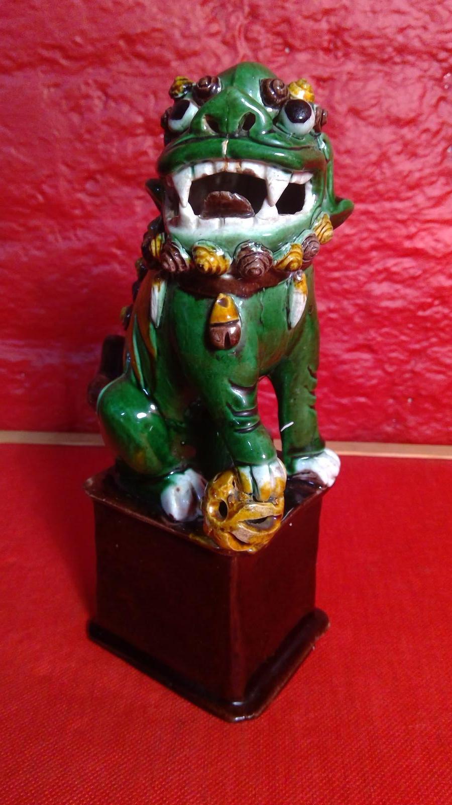 Chinese Antique Temple Dog Decorated in Vivid Green Famile Verte Glazes