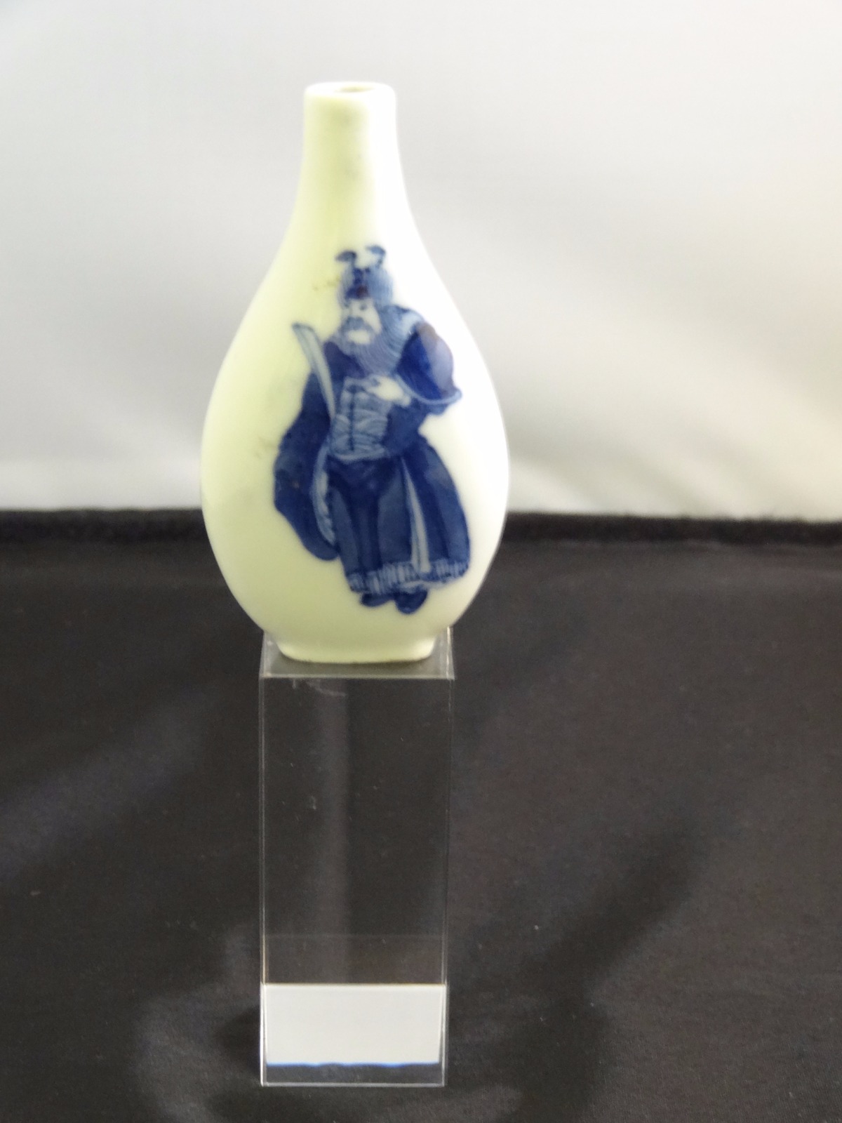 Chinese Blue and White Porcelain Snuff Bottle, Decorated with Standing Warrior 19th Century