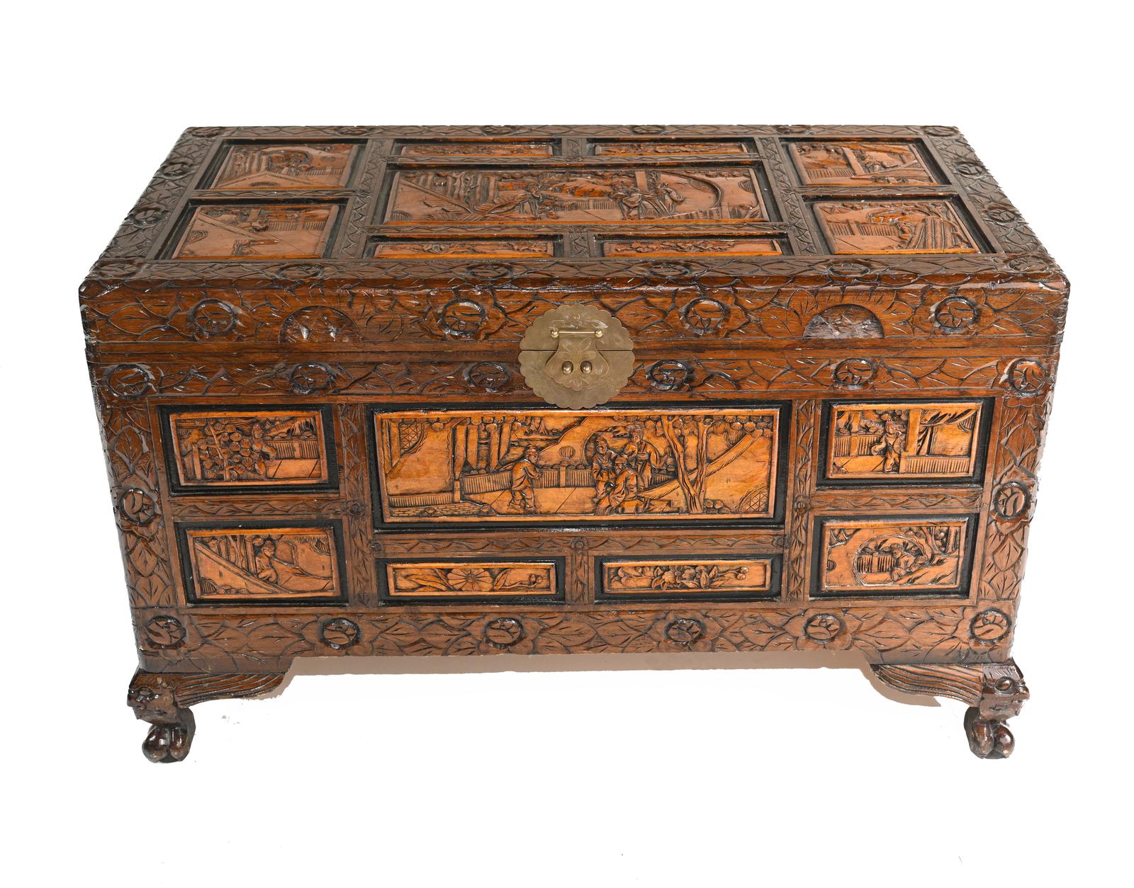 Chinese Carved Camphor Chest Luggage Trunk Antique