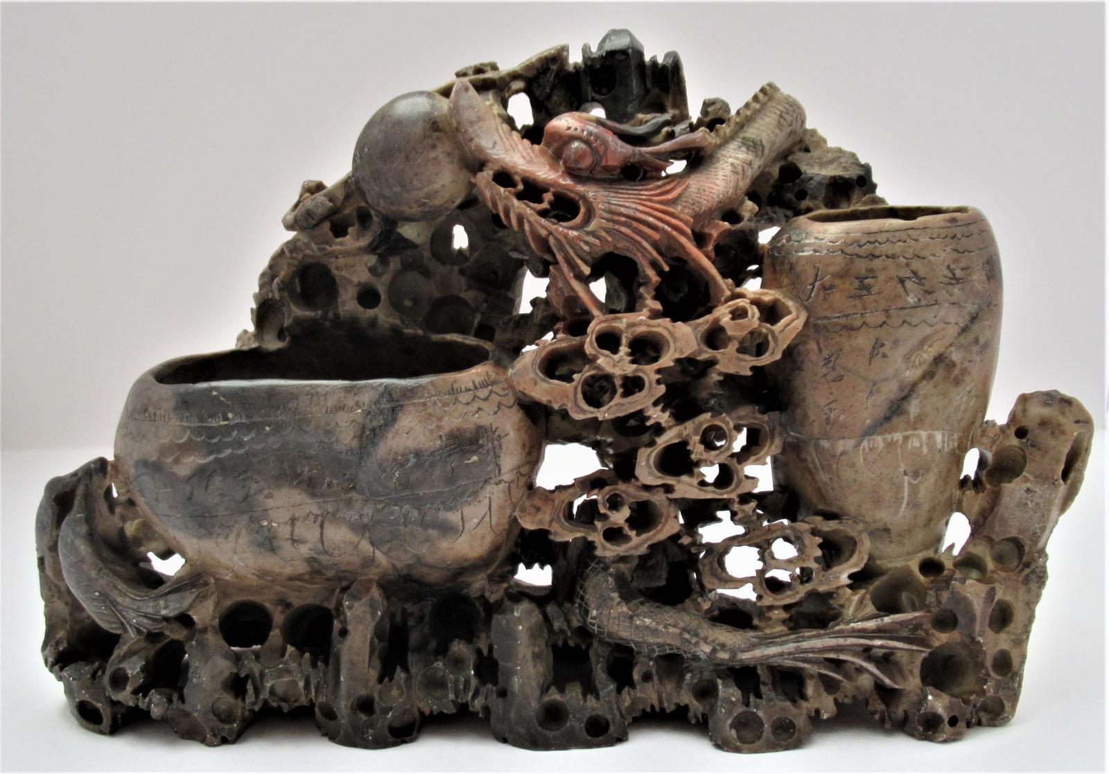 Chinese carved soapstone brushwasher, 19th century, dragon and pearl, inscribed