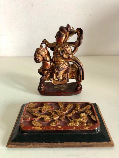 Chinese Carved Wood Warrior on Horse & Small Panel Polychrome Red and Gold