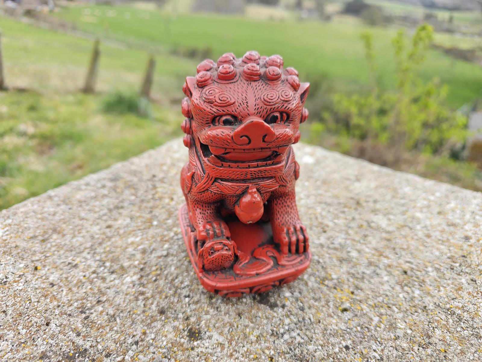 Here we have a wonderful and rare Cinnabar Lacquered pottery model of a Foo Dog or guardian lion, with a clay ball in his mouth. The ball rattles around nicely. Beautifully hand carved. Unusual to get Cinnabar over pottery models. Measures approx 12.5cm tall