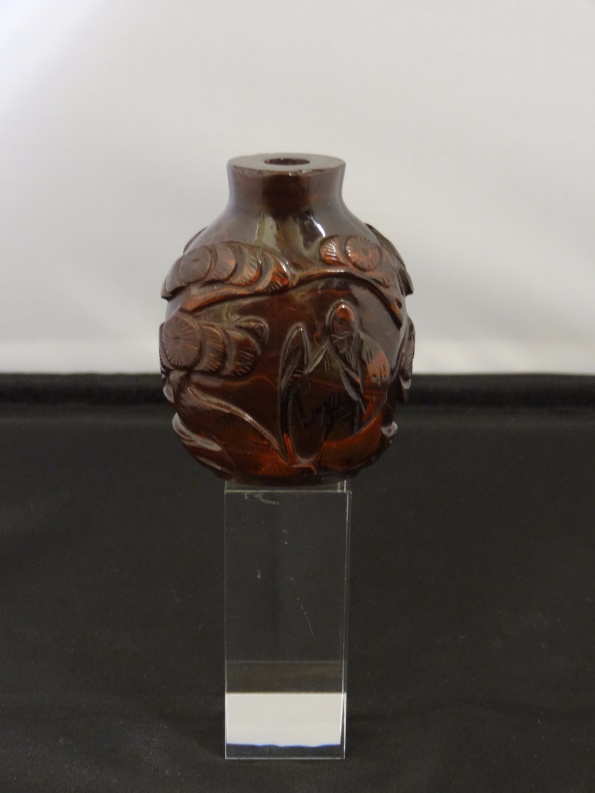 Chinese Dark Red / Brown Agate Snuff Bottle, Carved on Both Sides with Shoulao, 20th Century