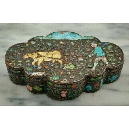 Chinese Export Cloisonne Enamel Silvered Copper Antique Opium Box Ox & Symbols