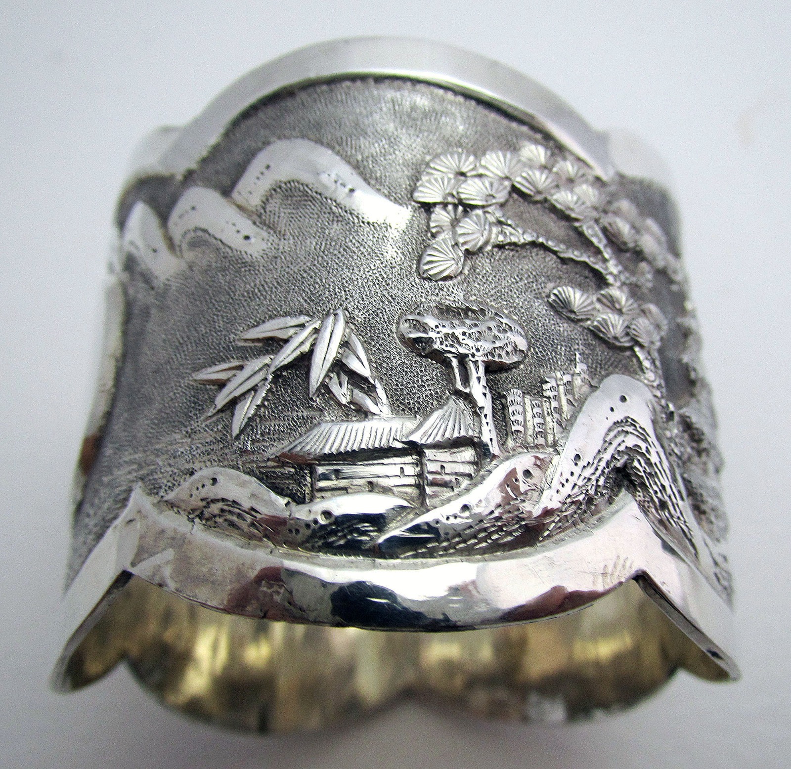 Chinese Export Woshing C.1880 Solid Sterling Silver Napkin Ring, RAre Shan Shui Scene, 19th Century (1 of 11)