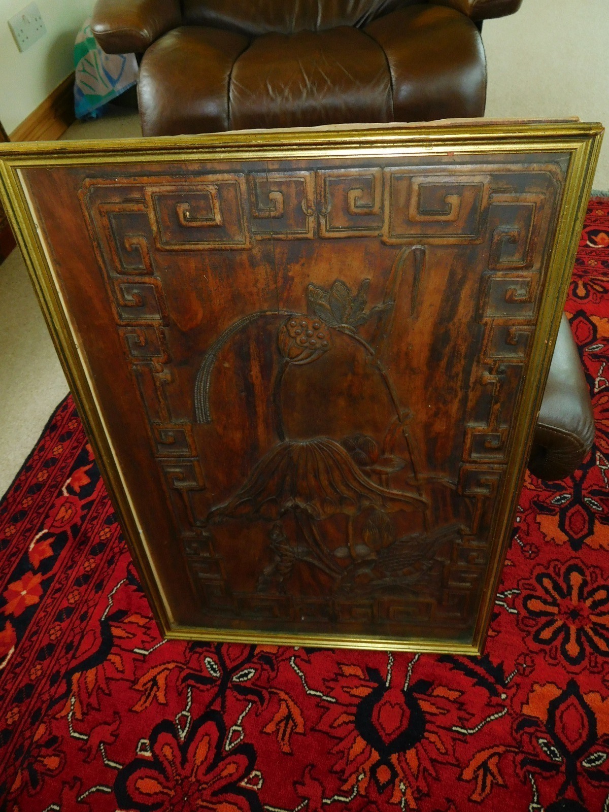 Chinese Framed Wood Carving of Poppies with Key Pattern Surround