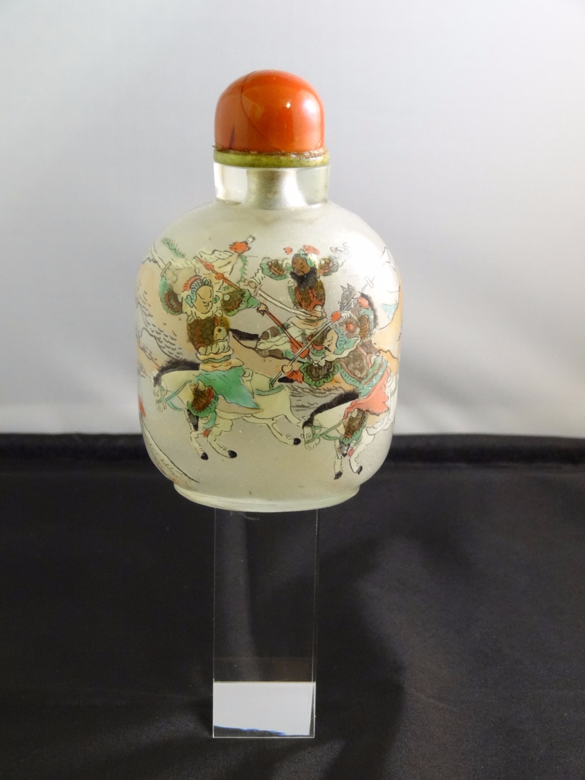Chinese Glass Snuff Bottle, Interior Painted with Scenes of Equestrian Skirmishes, circa 20th Century