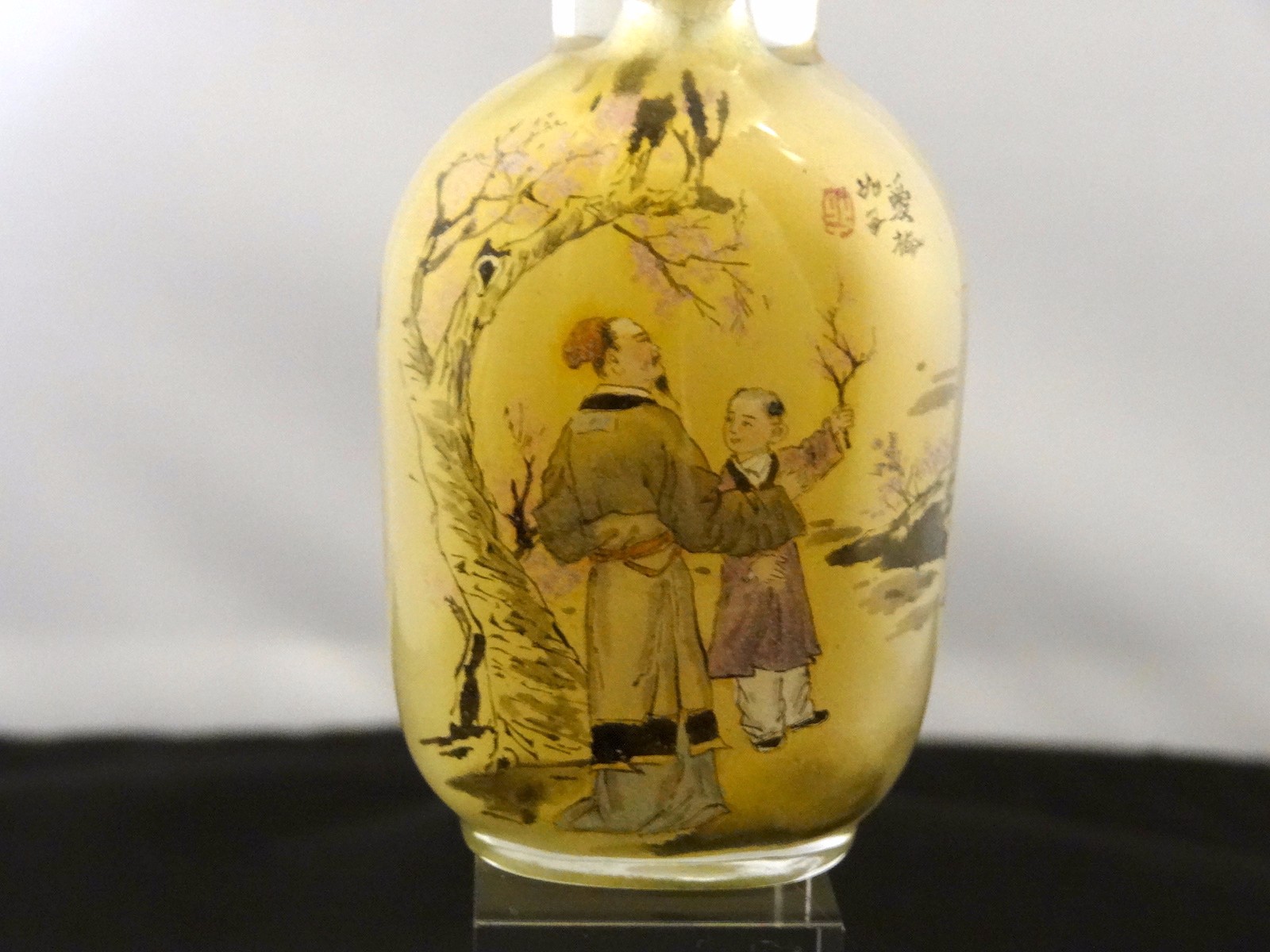 Chinese Interior Painted Glass Scent Bottle 'Scene of a Man and Boy' Chinese Calligraphy