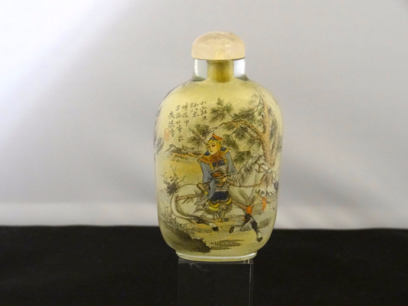 Chinese Interior Painted Glass Scent Bottle 'Scenes of Equestrian Warriors' Chinese Calligraphy