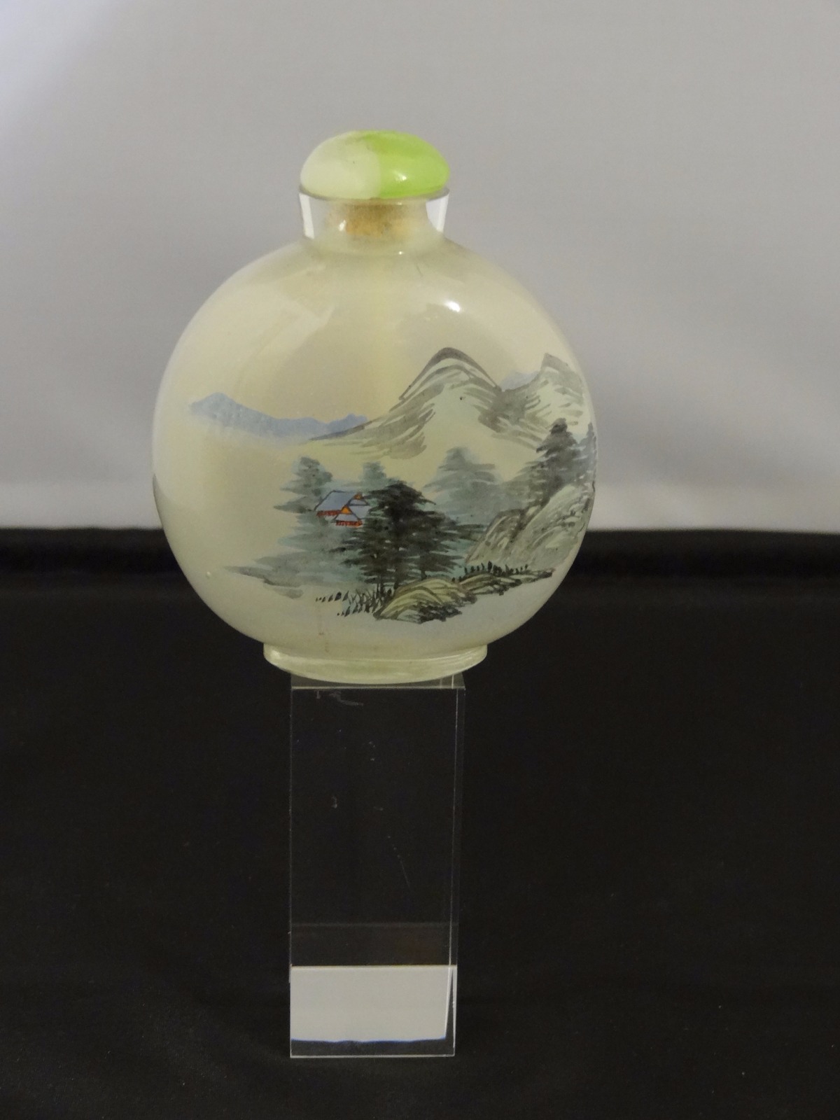 Chinese Interior Painted Glass Snuff Bottle, Circular Flask Form, 20th Century