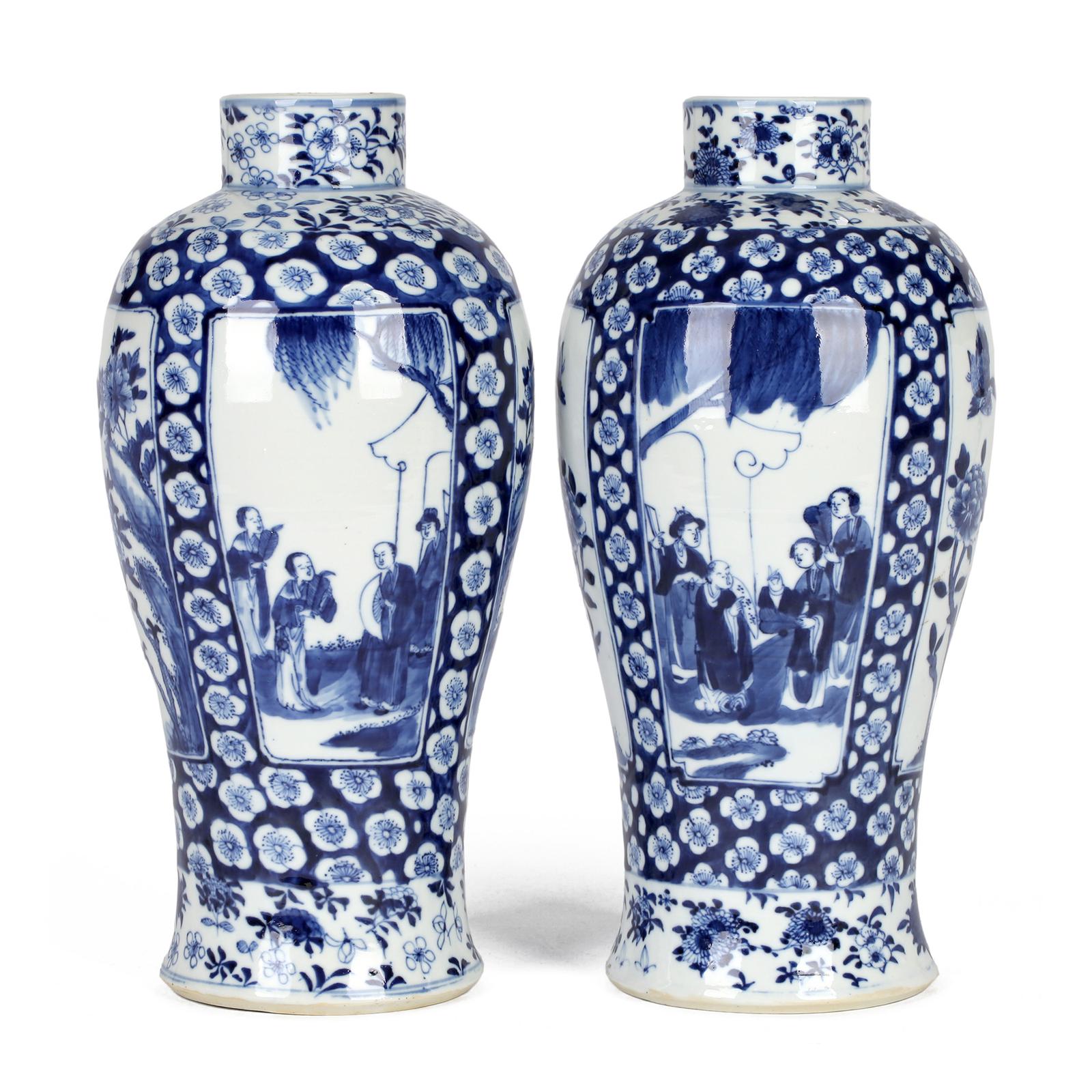 Chinese Pair of Large Blue & White Panel Vases with Figures Qing Dynasty