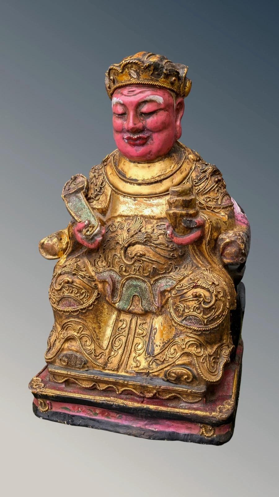 The figure is depicted enthroned with a high-tiered crown wearing robes richly ornamented and hand painted in red, gold and black. In his hand he holds ritual attributes including a Ruyi sceptre which symbolises power authority and good fortune. This throne is raised on a square plinth base fine gilded cabling ornamentation.