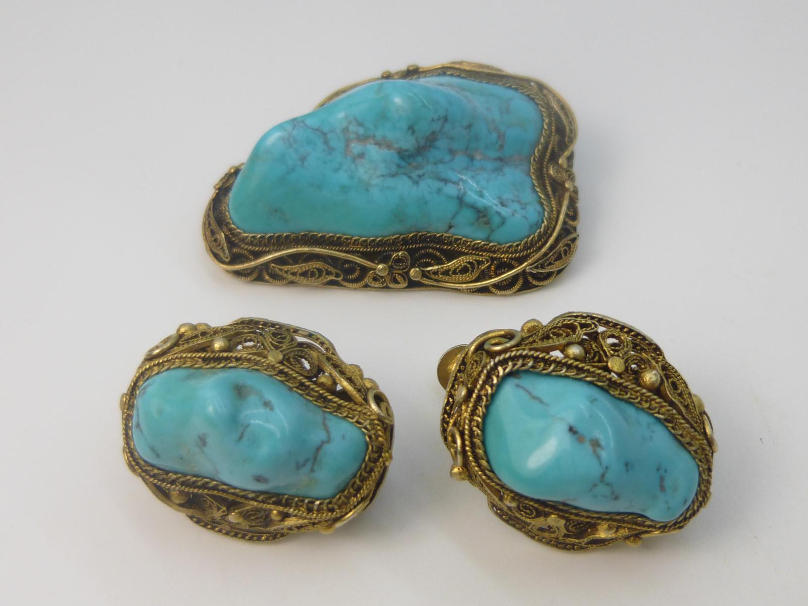 Chinese Silver Gilt & Turquoise Earrings + Brooch