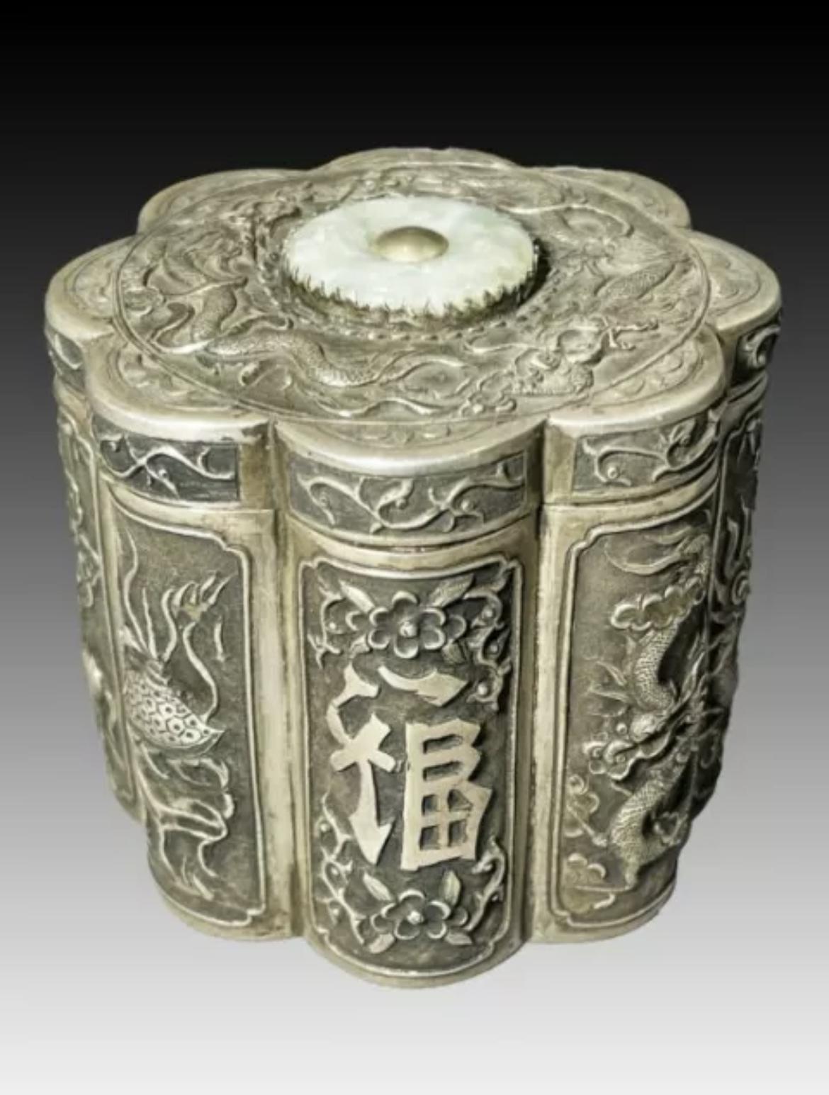 Chinese Silver & Jade Dragon Box Qing Dynasty