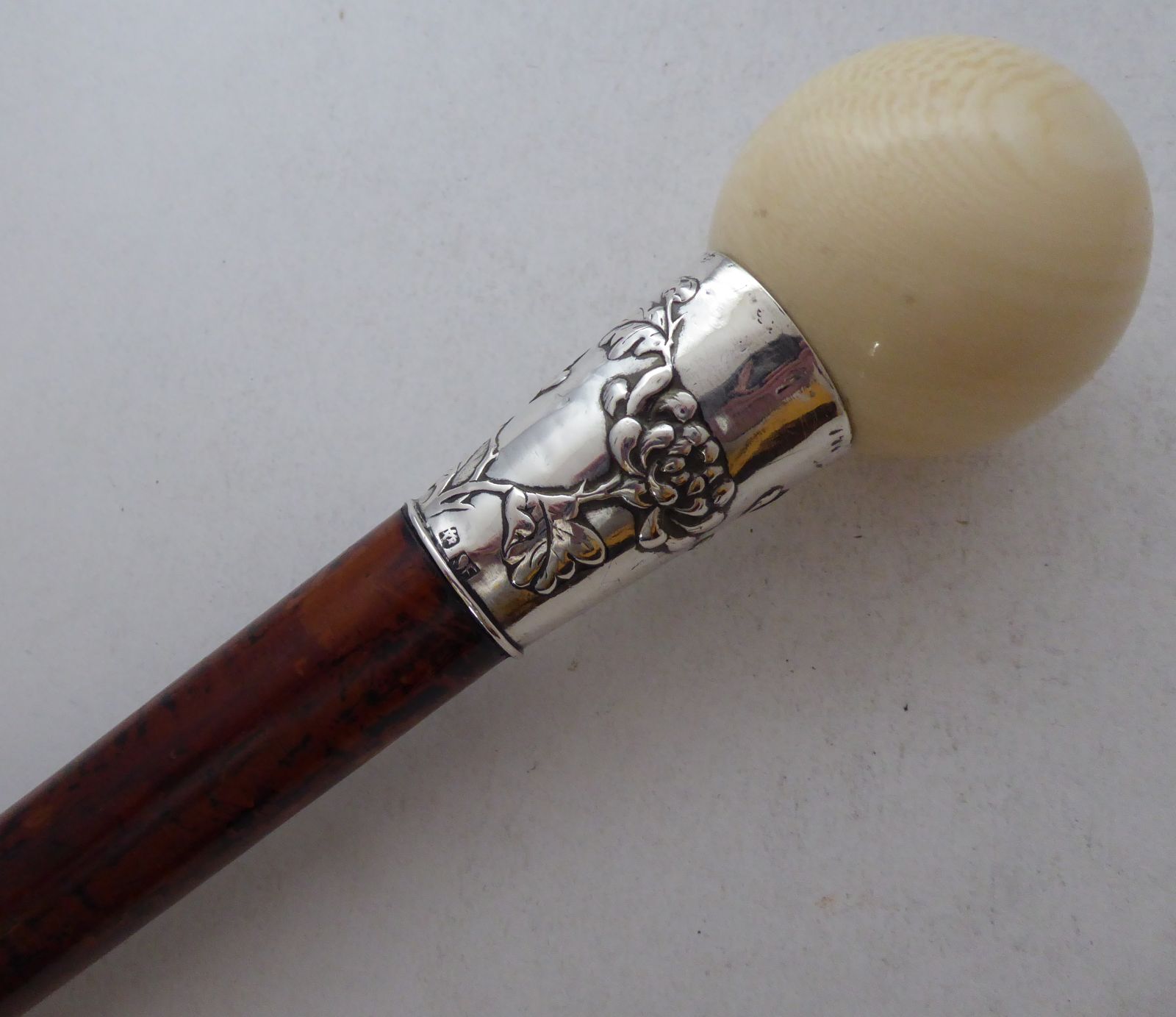 Chinese Walking Stick Cane Solid Silver Collar Tagua Nut Malacca Shaft c.1910