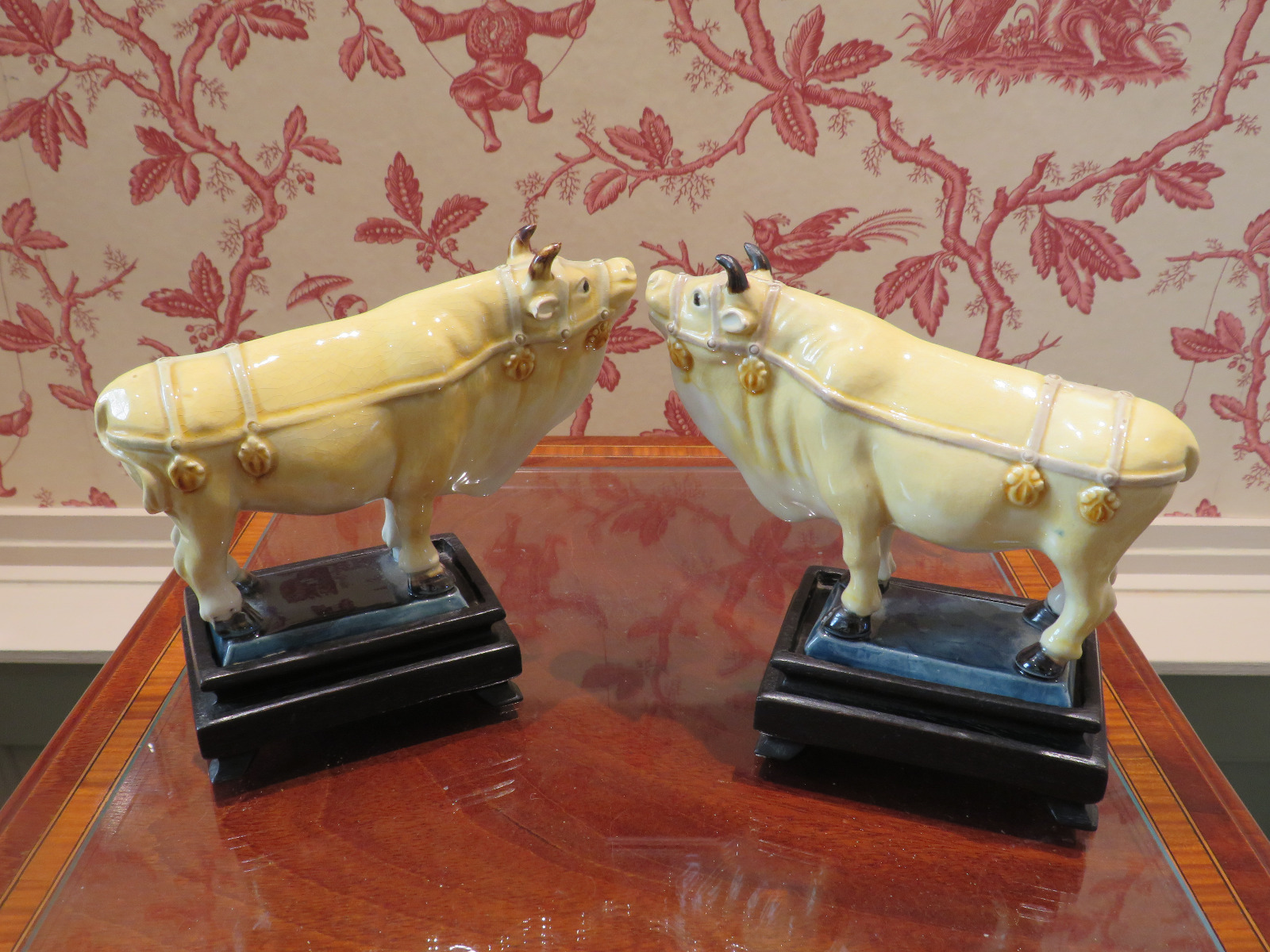 Chinese Yellow Glaze Bulls on Wooden Stands