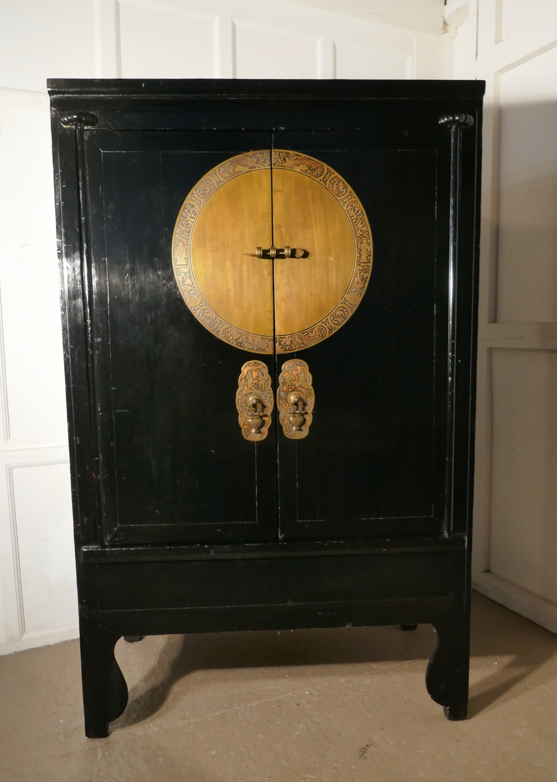 Chinoiserie Art Deco Black Lacquer & Brass Cupboard