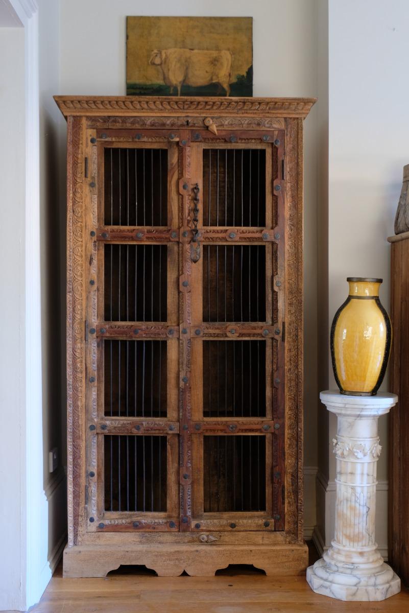 Chipped Carved Hardwood Storage Cupboard With Iron Bar Doors