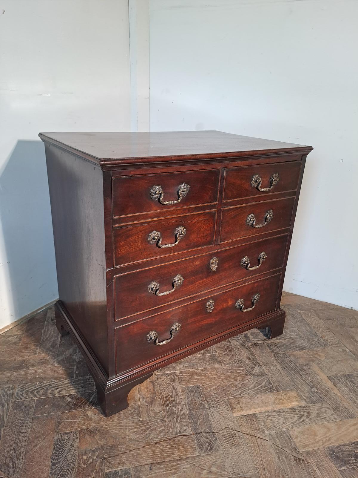 This elegant 18th-century commode retains its original character and proportions, with a beautifully figured Cuban mahogany case and original rococo swan neck handles of excellent quality. The piece stands on a shaped plinth base and displays the refined craftsmanship associated with the Chippendale period.