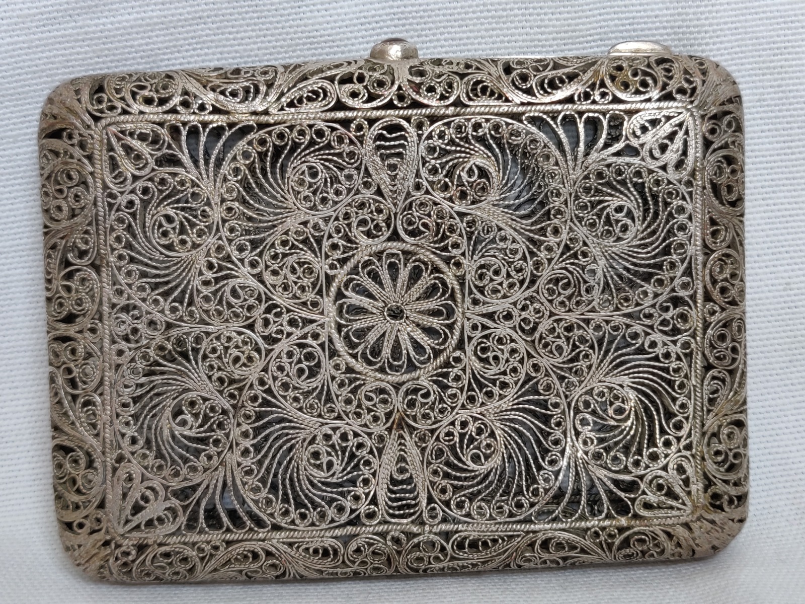Cigarette Case Silver Plated Brass / Copper Filigree Case with Amber Button / Clasp