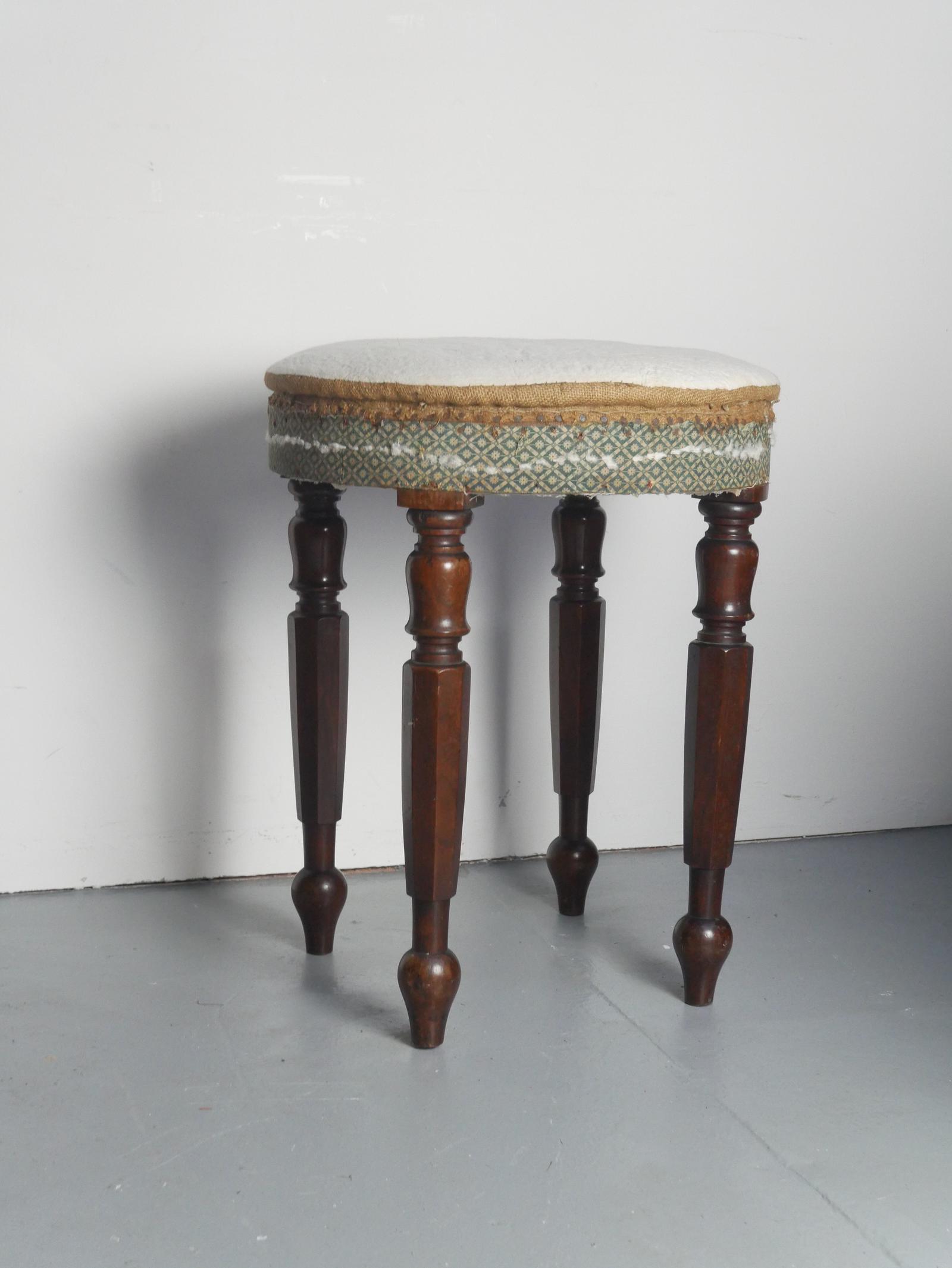 This circular top stool stands at a height of 58.5cm and is believed to have been created around 1840. The stool features a classic design typical of the period, with a round seat supported by sturdy legs. Excellent mahogany turned legs, very stable, for upholstery, all strong.