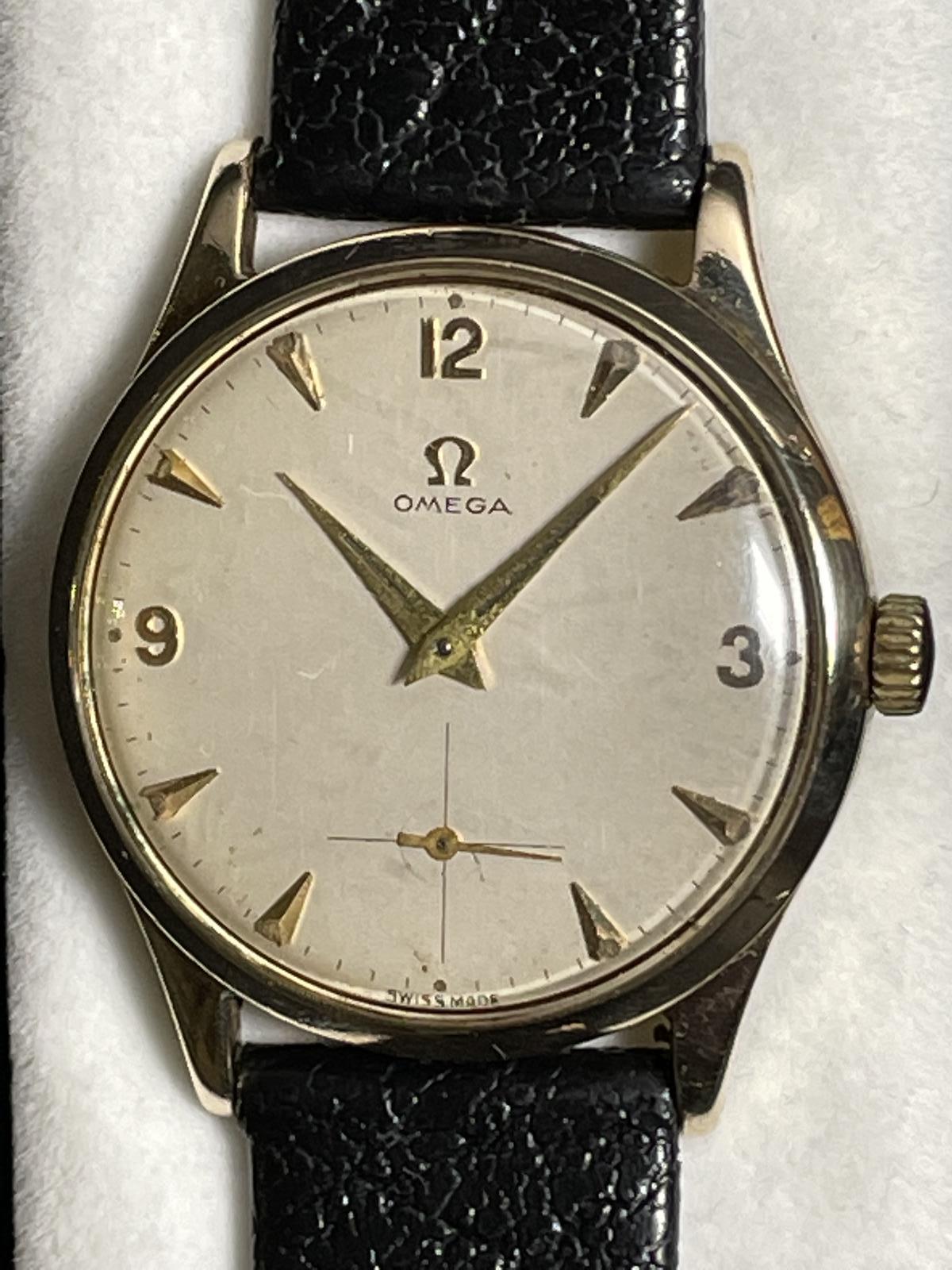 Classic 1950s Gentleman's 9ct Gold Omega Wrist Watch on Black Leather Strap