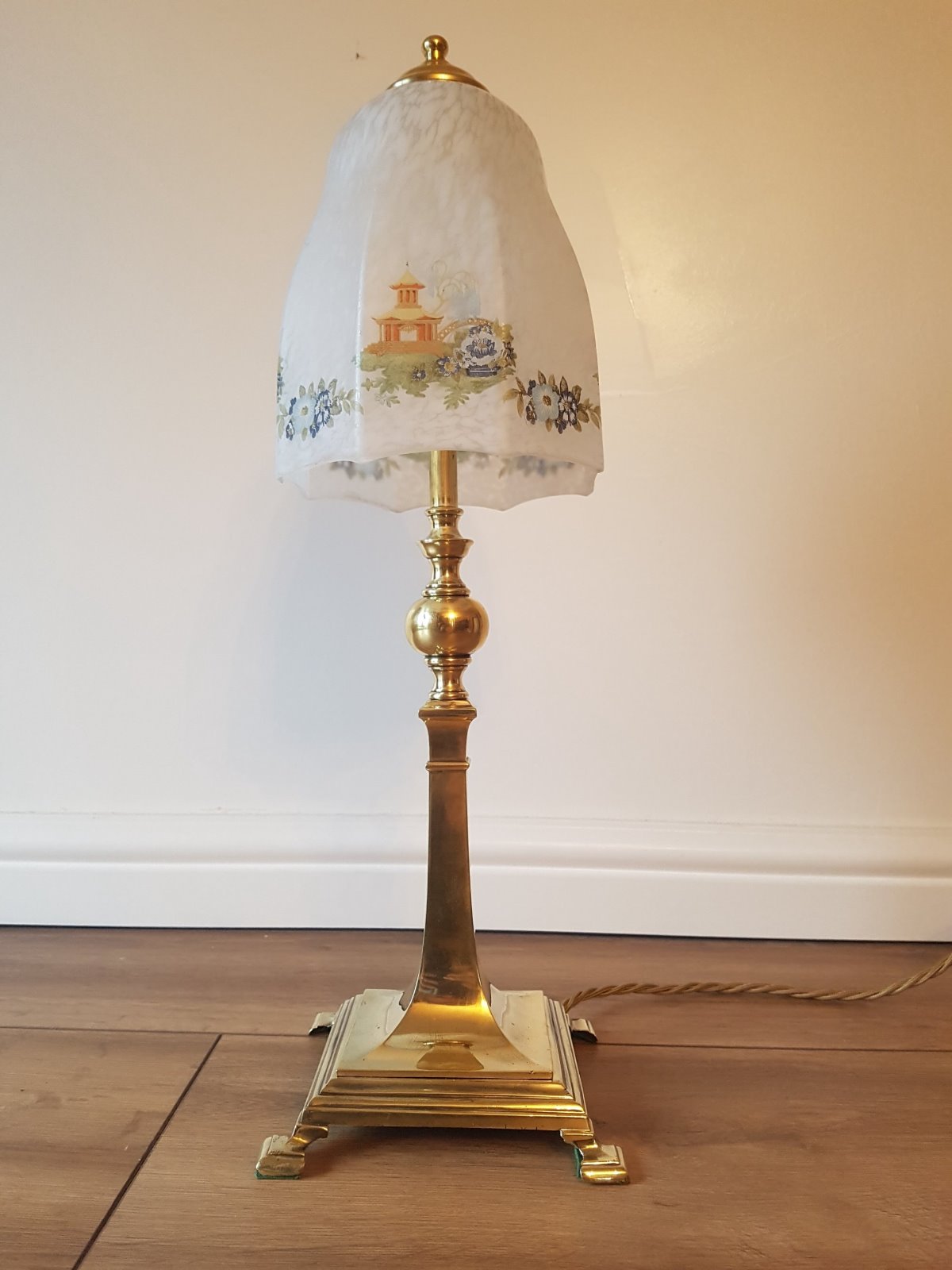 Classical Brass Base Table Lamp with Decorated Chinese Ceramic Shade; Pat Tested c.1920