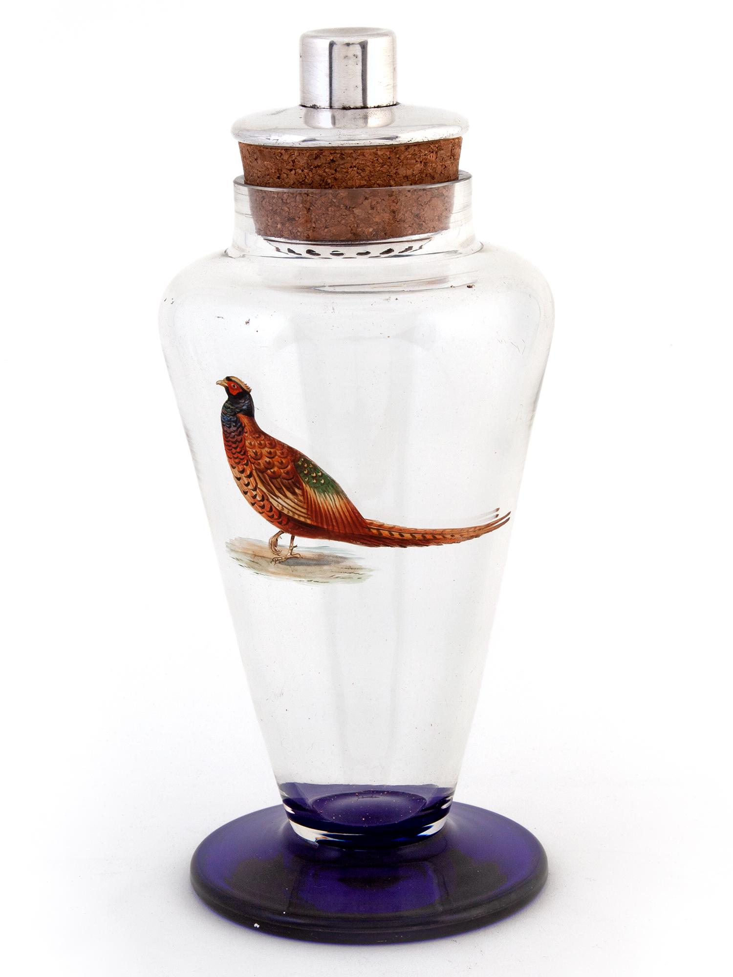 Clear Glass & Silver Plated Cocktail Shaker with Enamel Painted Pheasant (1 of 5)