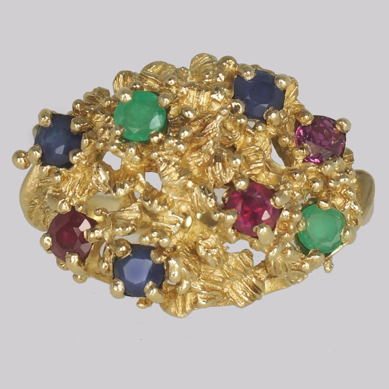 Cluster Ring Ruby Sapphire Emerald London 1973 Gold Vintage Cocktail Bombe Ring