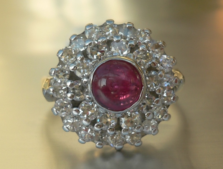 Cluster Ring with Central Ruby Cabochon in 18ct White Gold