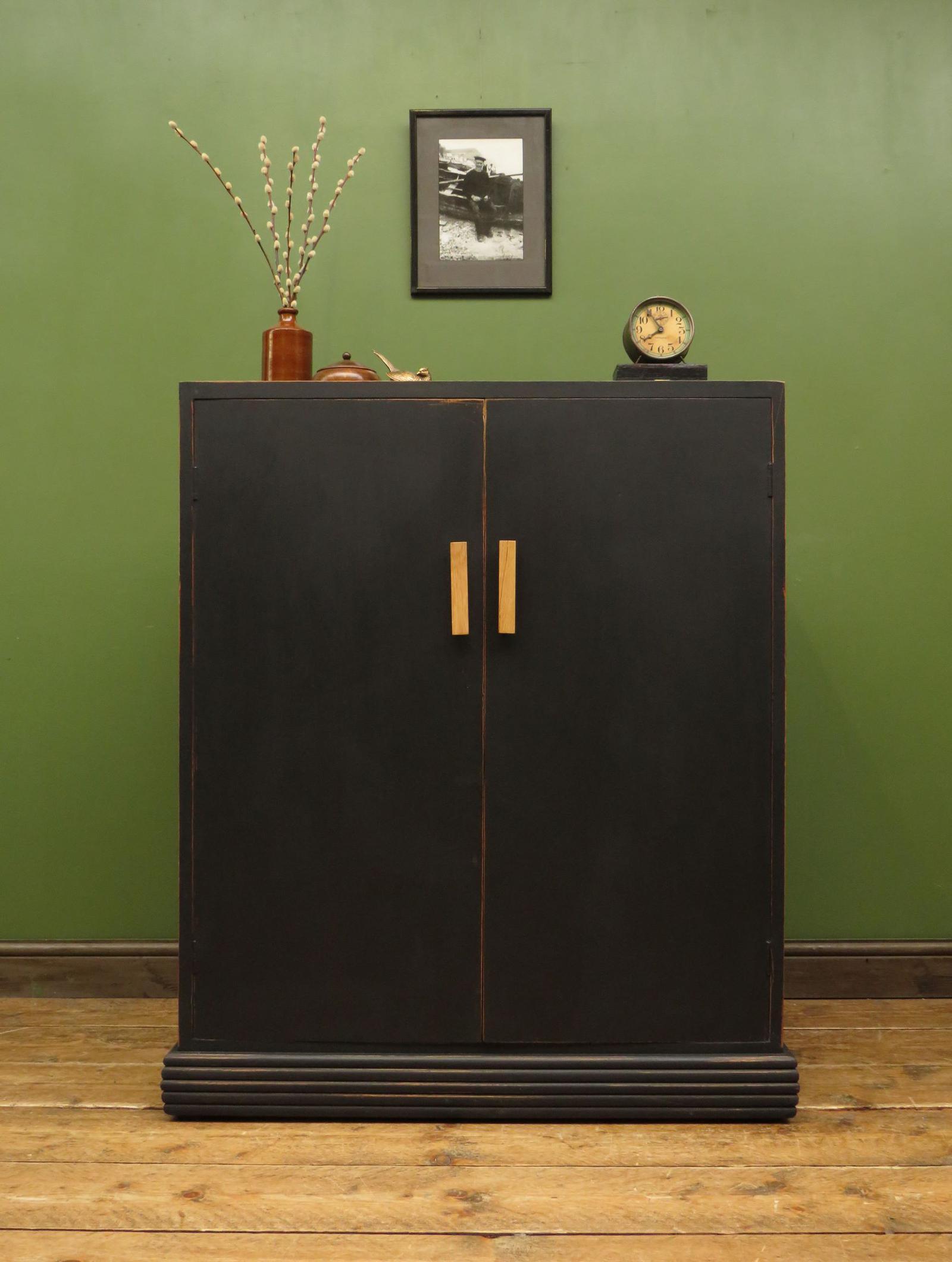 Compact Art Deco Style Black Painted Linen Press Cupboard with Slides, 1950s