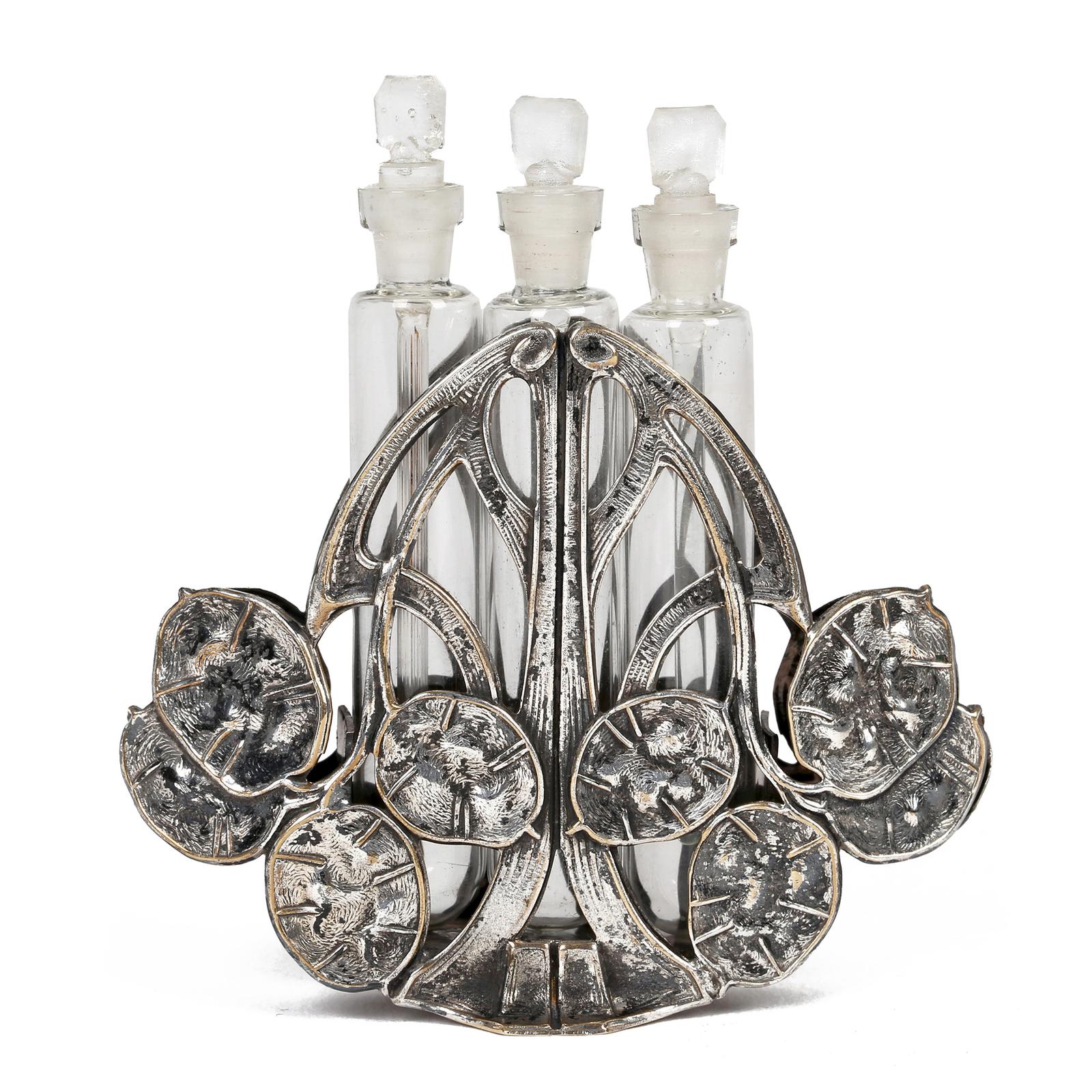 Continental Art Nouveau Silver Plated Scent Bottle Holder with Three Scent Bottles
