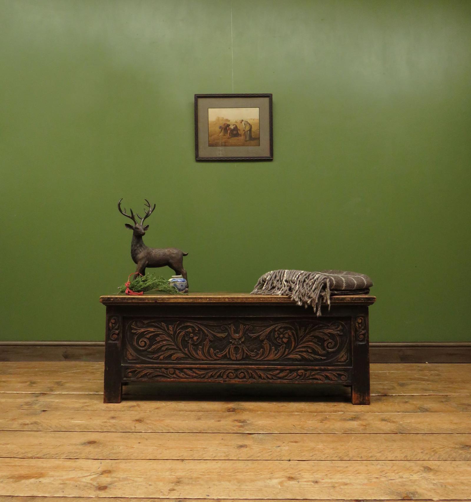 Continental Carved Oak Coffer, Blanket Box, Hall Storage Chest for shoes