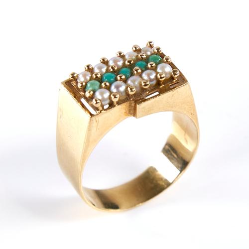 Continental High Carat Gold Turquoise & Pearl Triple-row Signet Ring, setting height 10.2mm, size Q, 5.8g